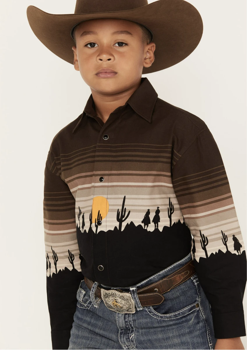 Panhandle Boy’s Brown Cowboy Sunset Ombre Snap Long Sleeve Shirt