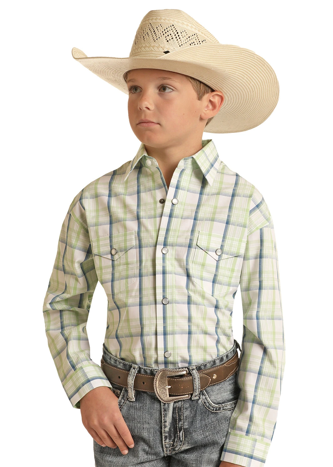 White, Blue and Green Plaid Long Sleeve Snap Front Shirt.