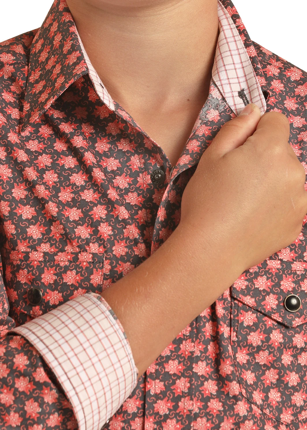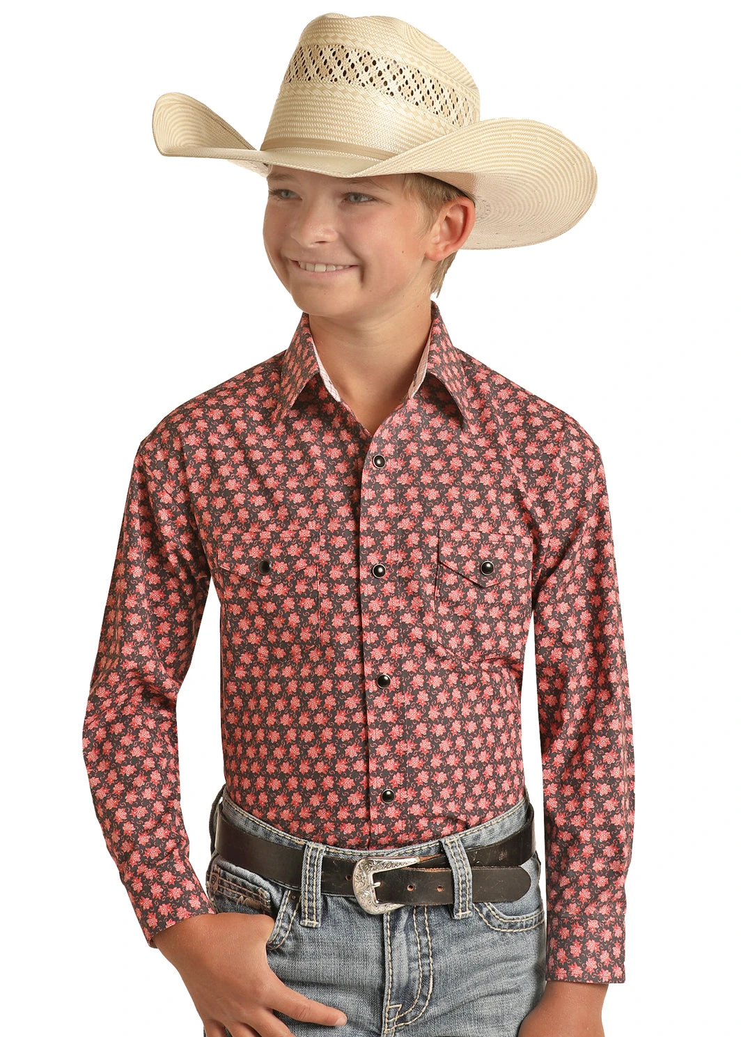Peach Floral Print Long Sleeve Snap Front Shirt.