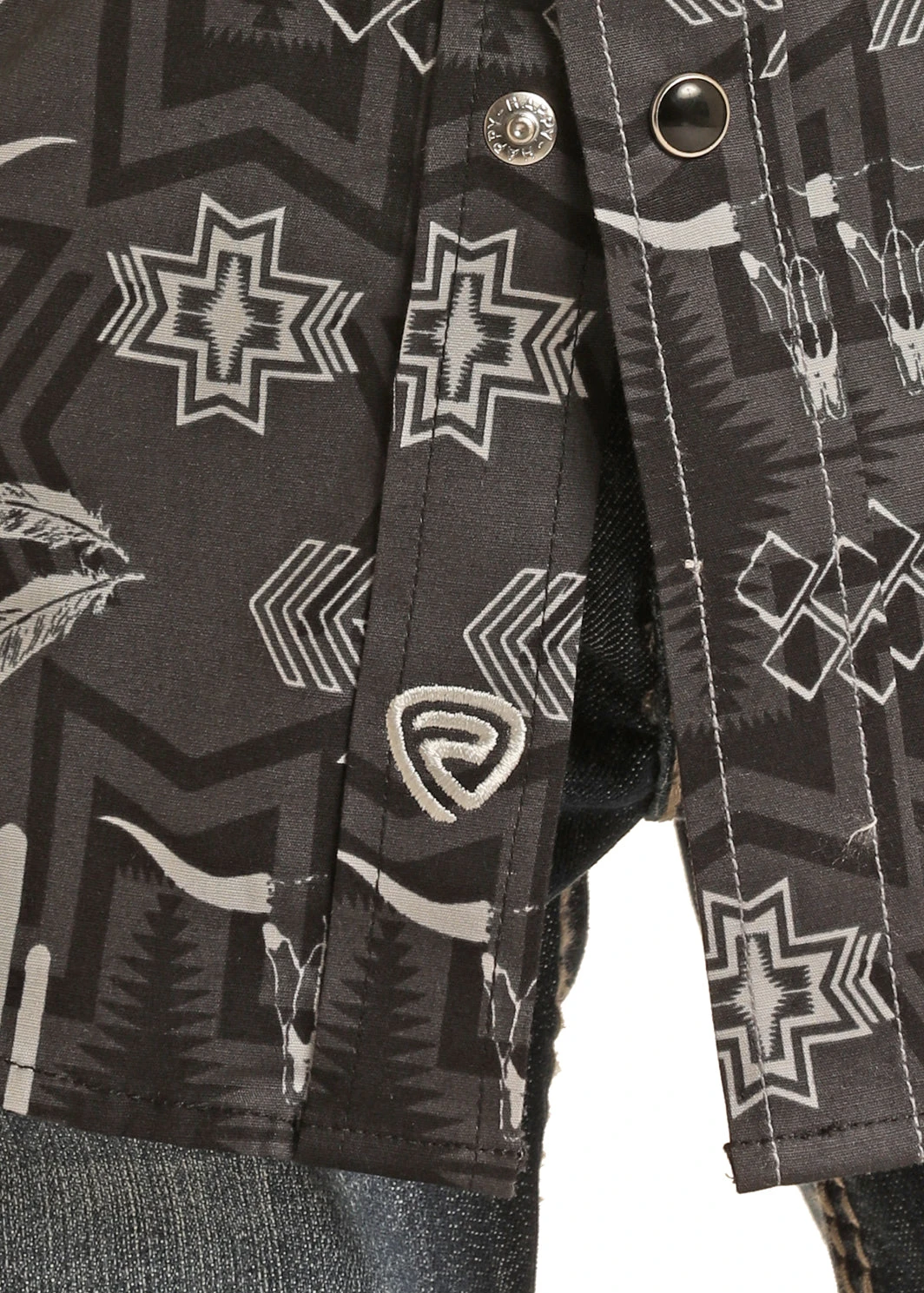 Black and Grey Aztec Long Sleeve Snap Front Shirt with White Feather, Cactus and Skull Over Print.