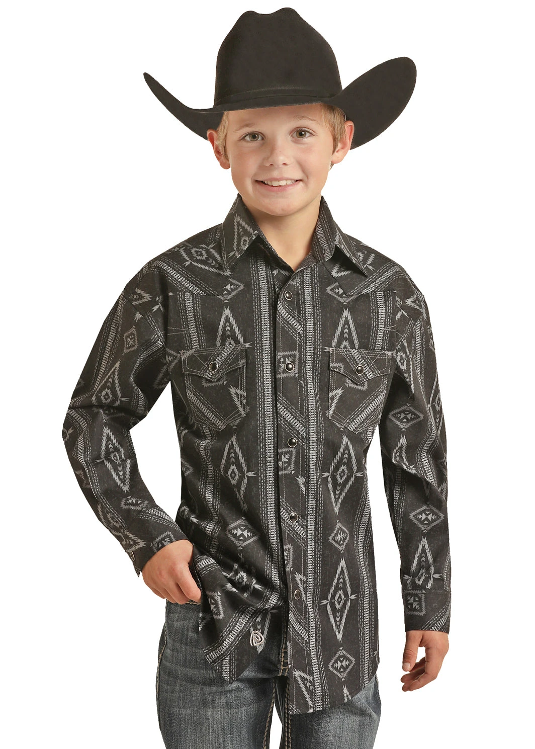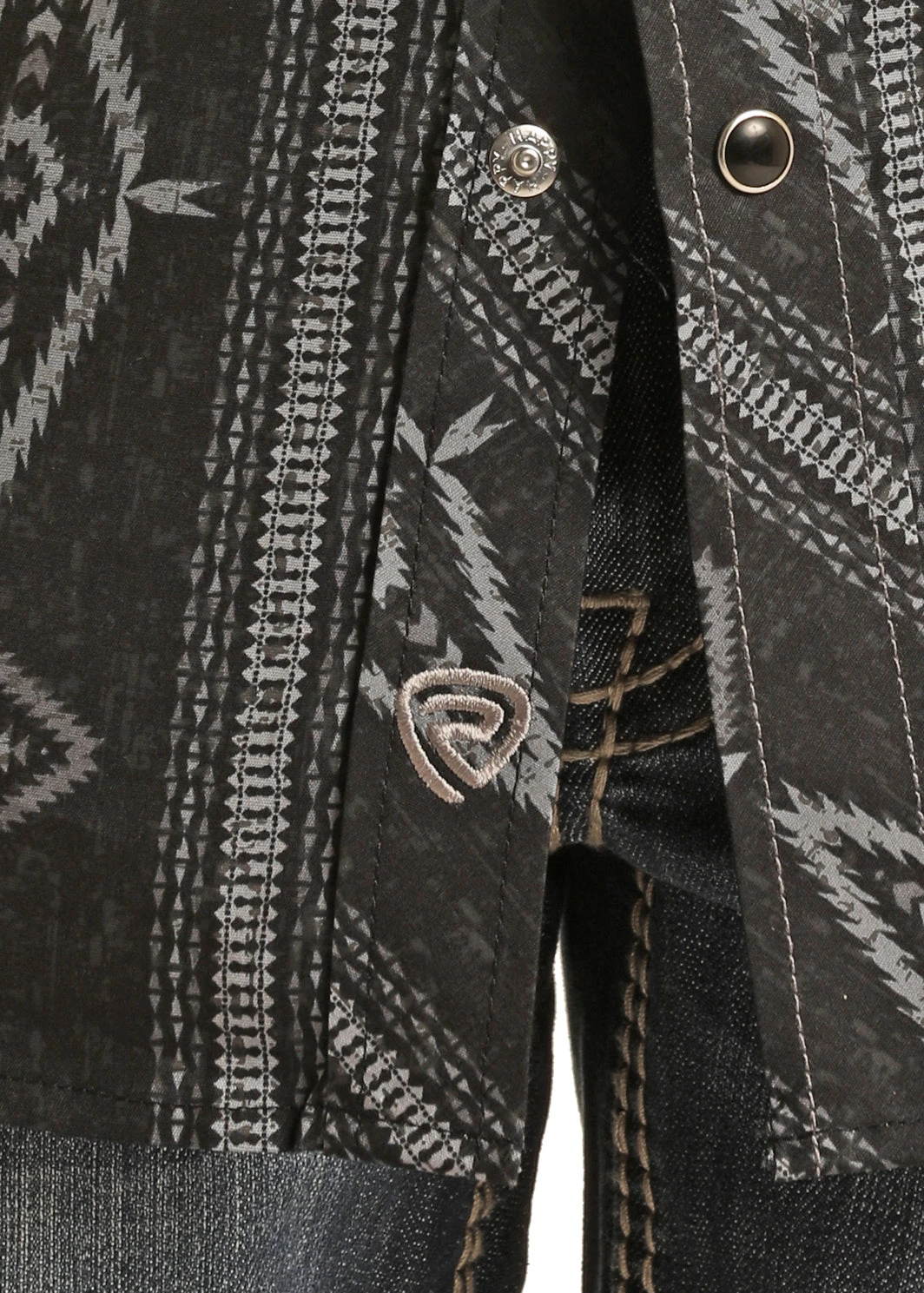 Black and Charcoal Aztec Print Long Sleeve Snap Front Shirt.