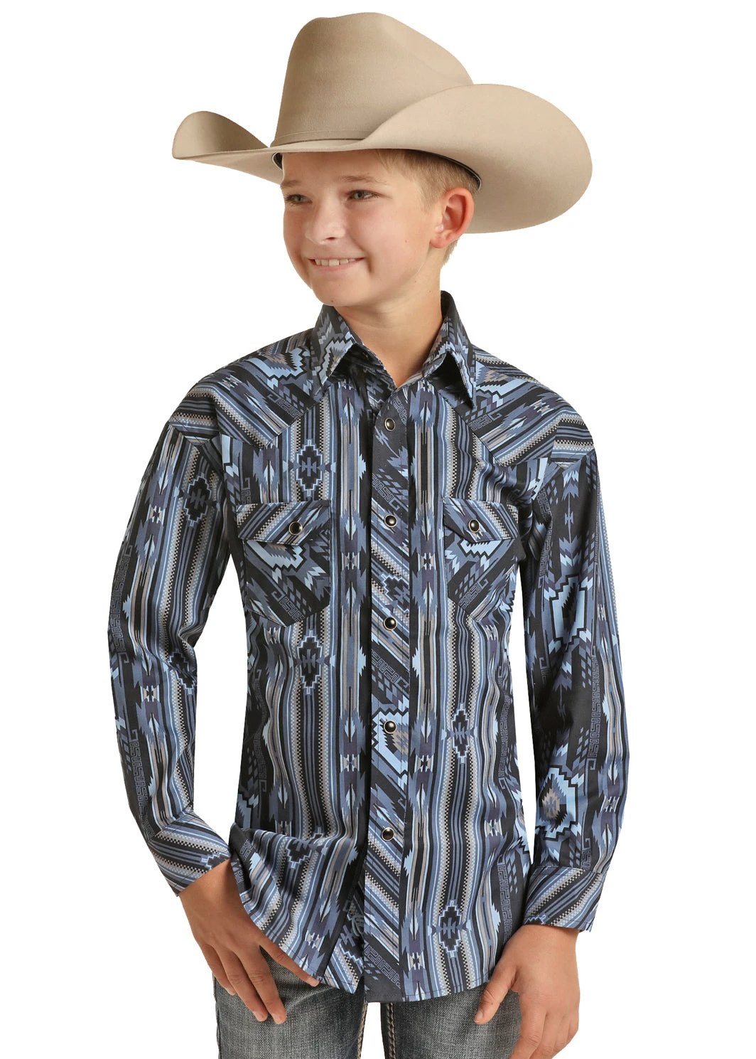Multi Blue Aztec Long Sleeve Snap Front Shirt.
