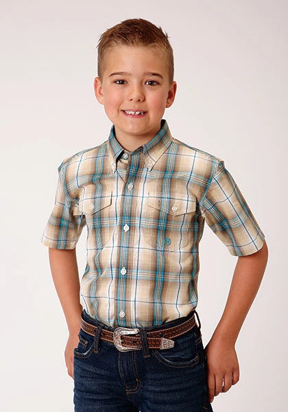 Turquoise Saddle and Tan Plaid Short Sleeve Button Down Shirt.