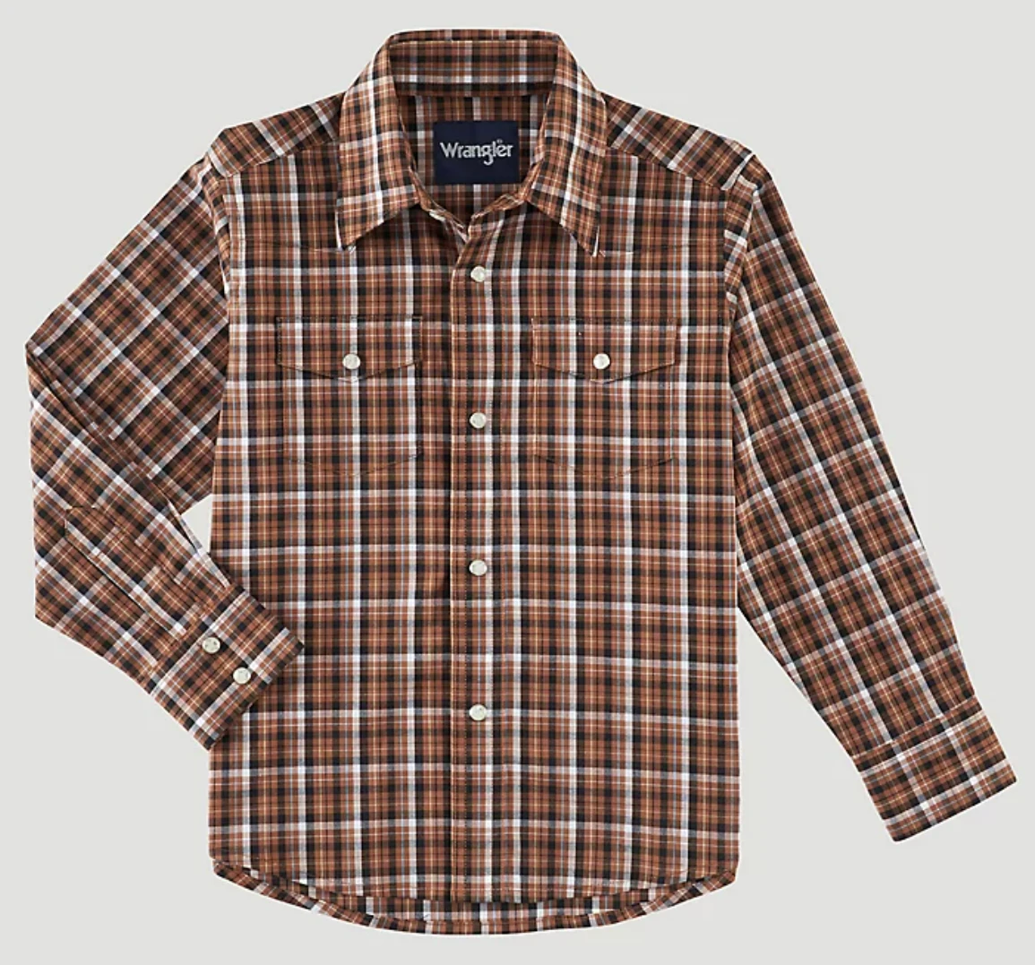 Coffee Plaid Long Sleeve Wrinkle Resist Snap Front Shirt.