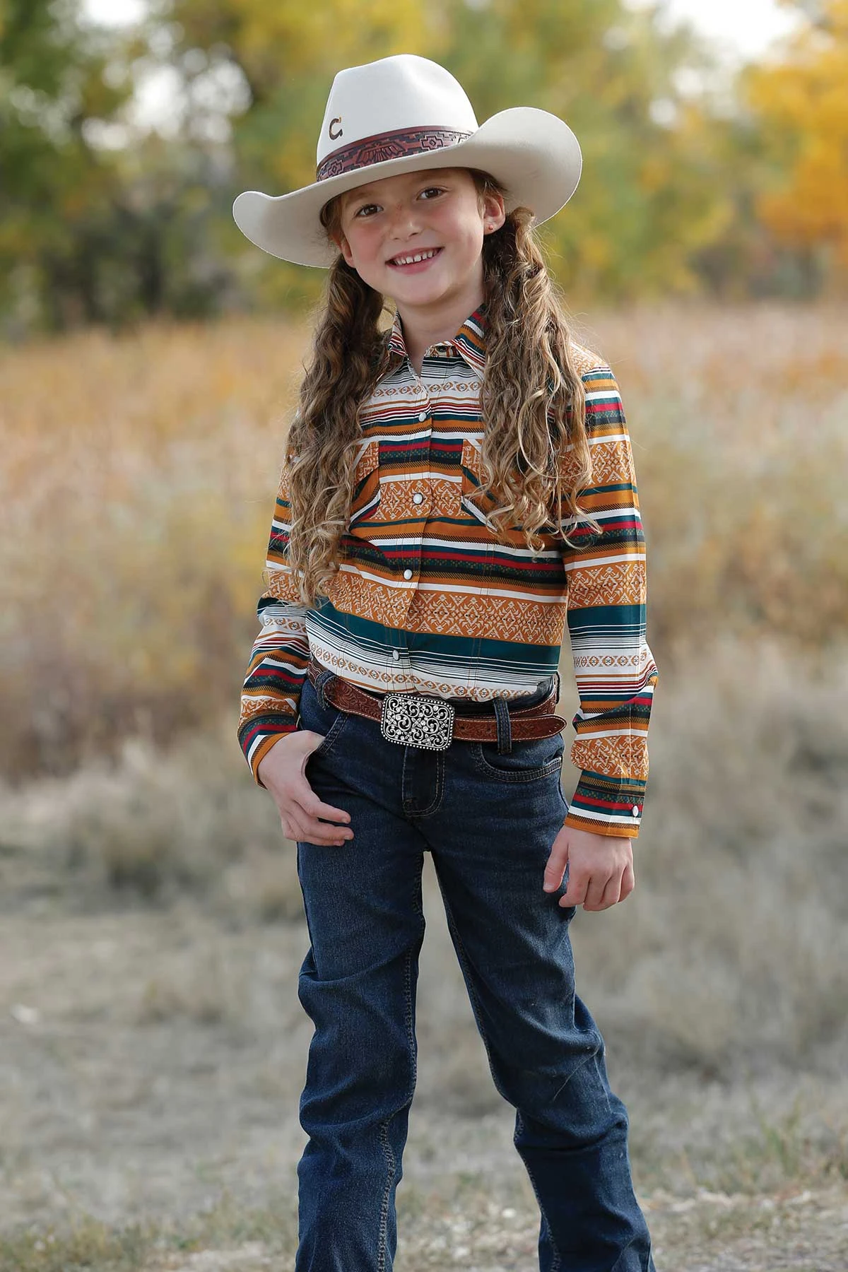 Gold and Multicolor Southwest Print Long Sleeve Snap Front Shirt.