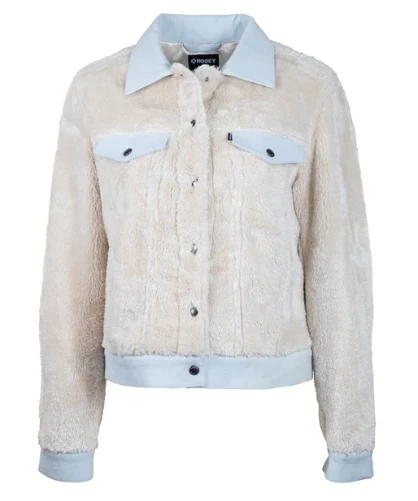 Cream Sherpa Jacket with Denim Accents.
