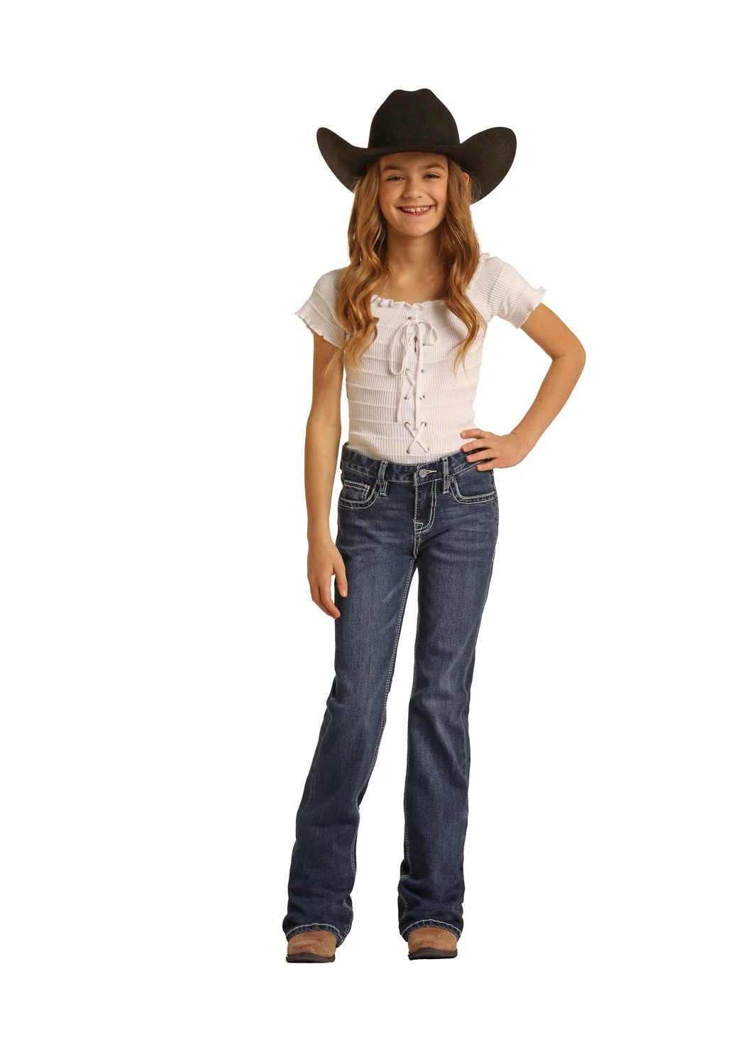 Medium Wash Jean with Blue and Ivory Aztec Pockets.