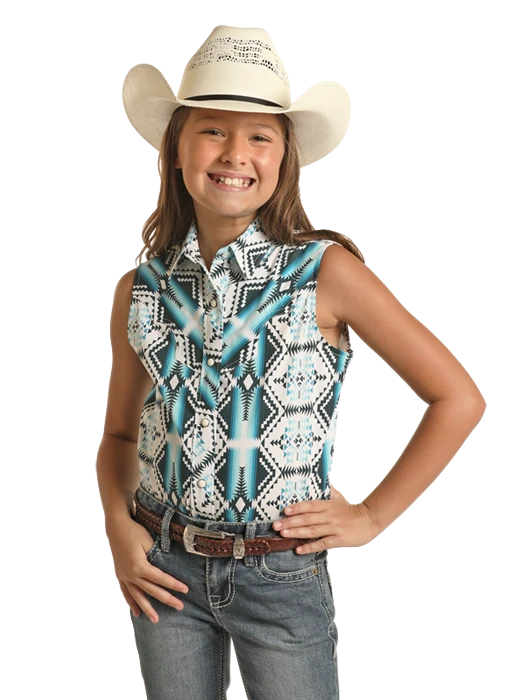 Teal and White Aztec Print Sleeveless Snap Front Shirt.