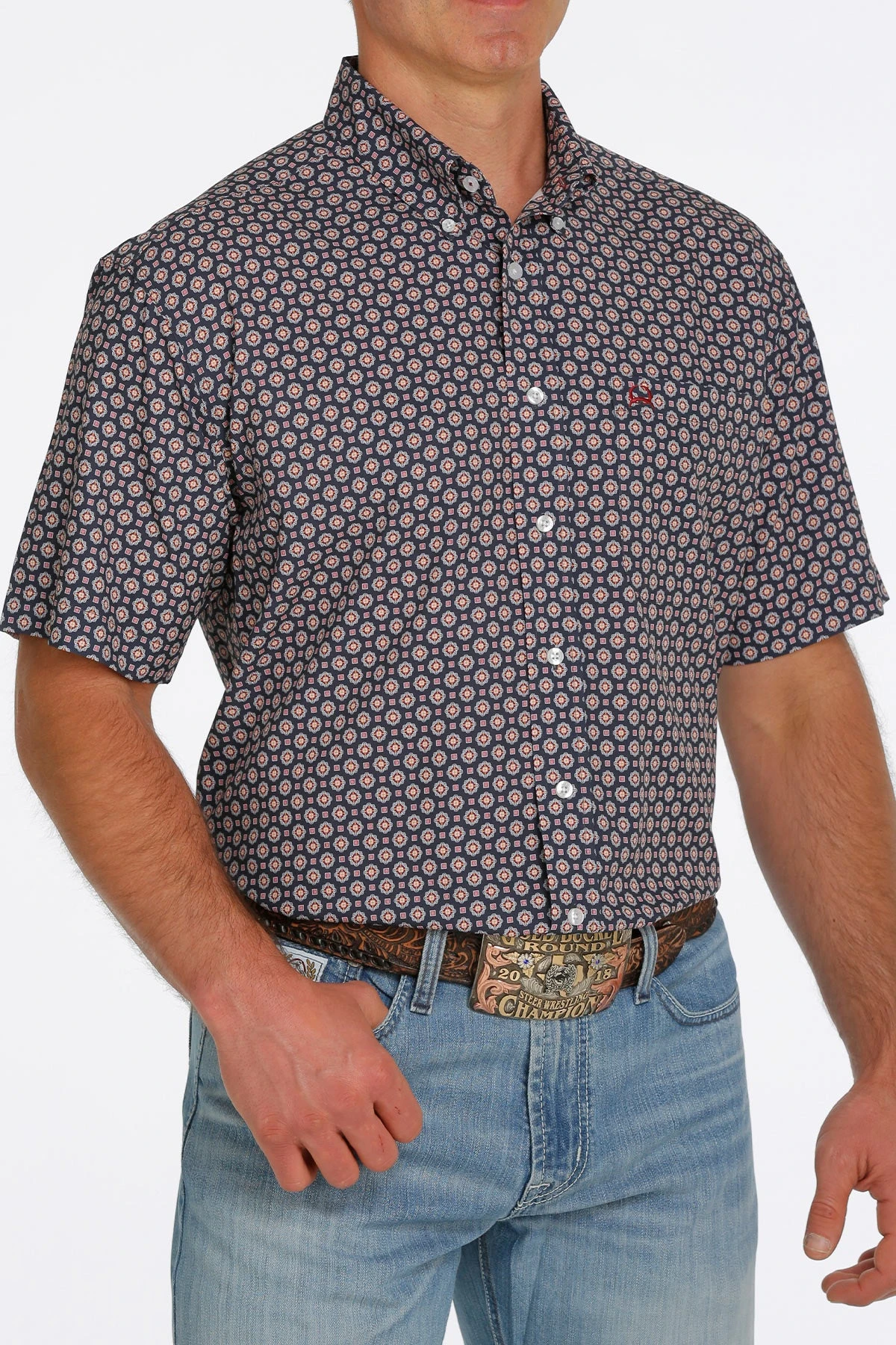 Navy, Orange and Red Medallion Print Short Sleeve Arenaflex Button Down Shirt.
