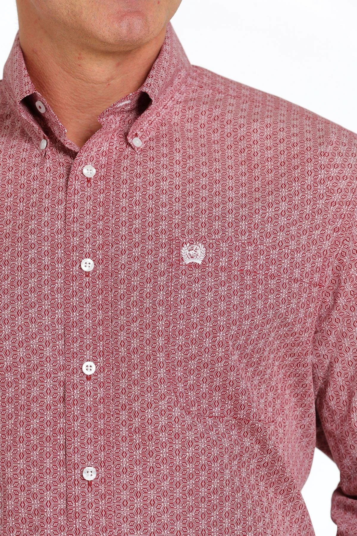 Burgundy and White Geometric Print Long Sleeve Button Down Shirt.