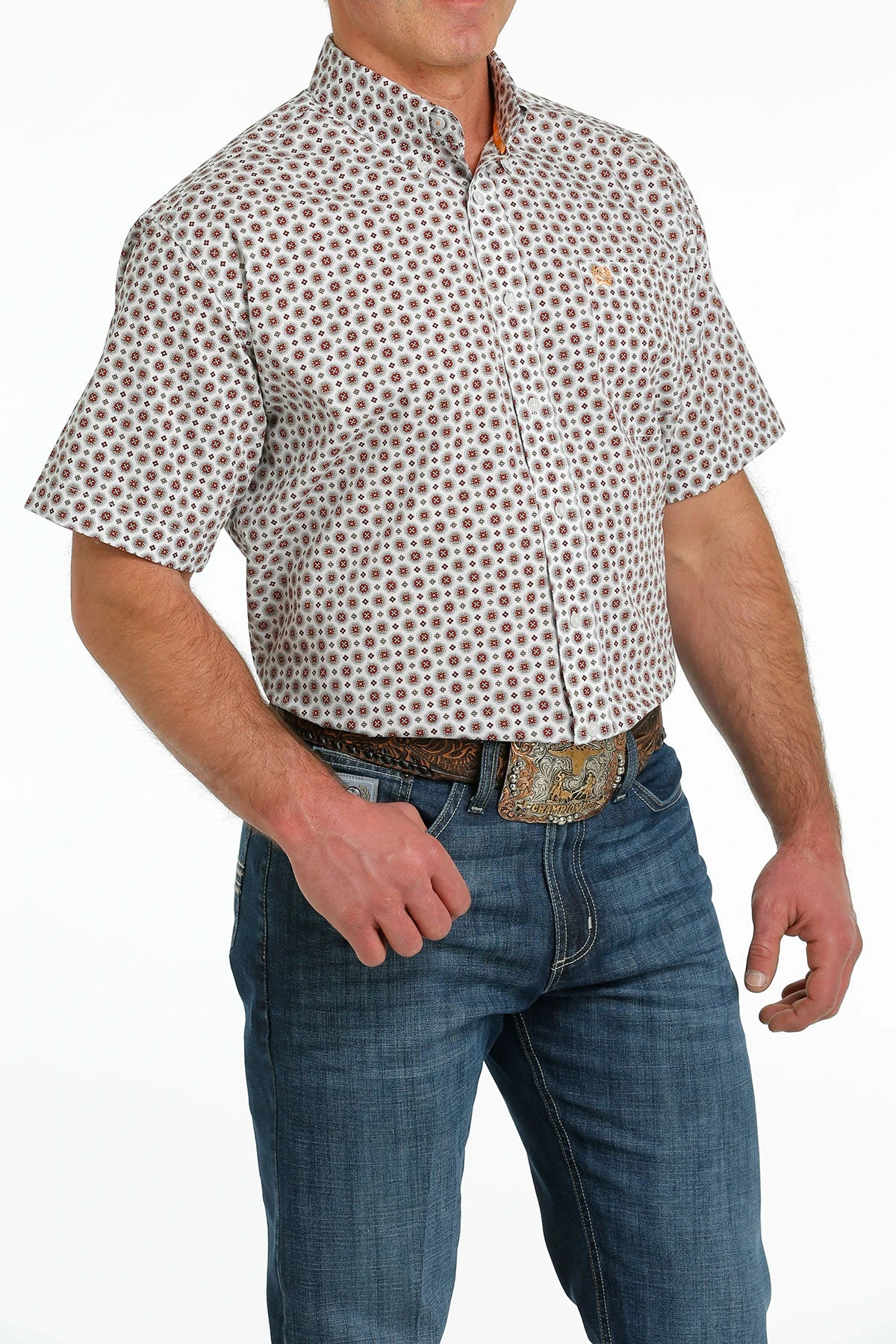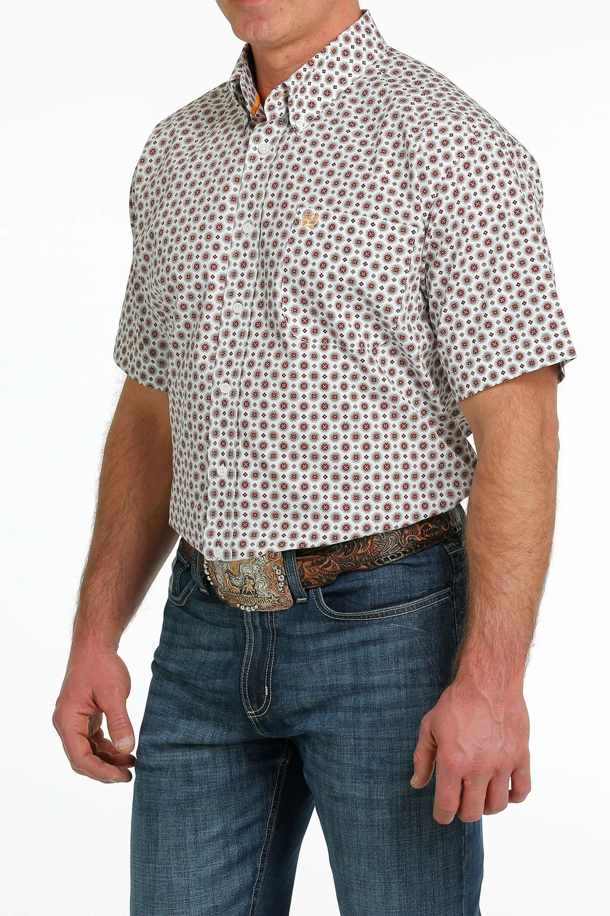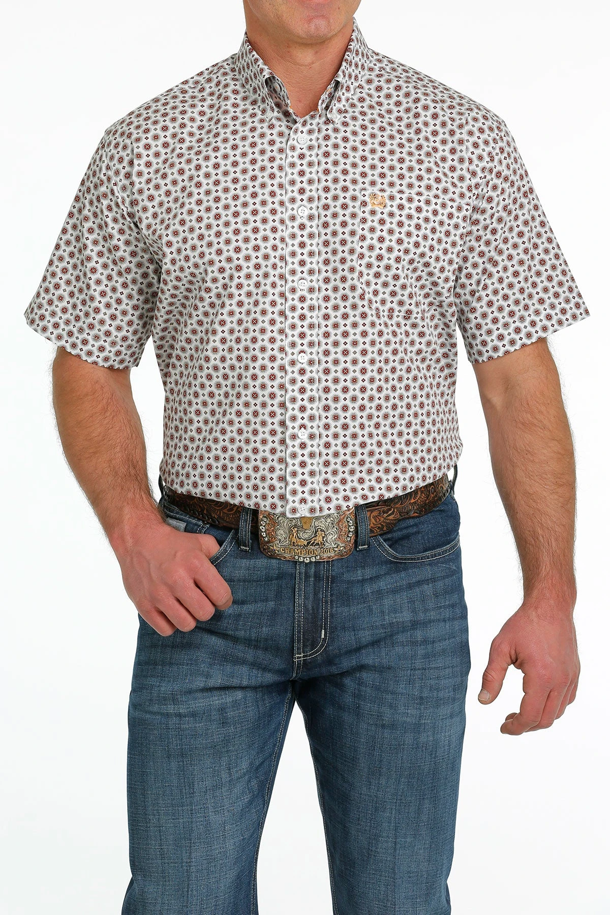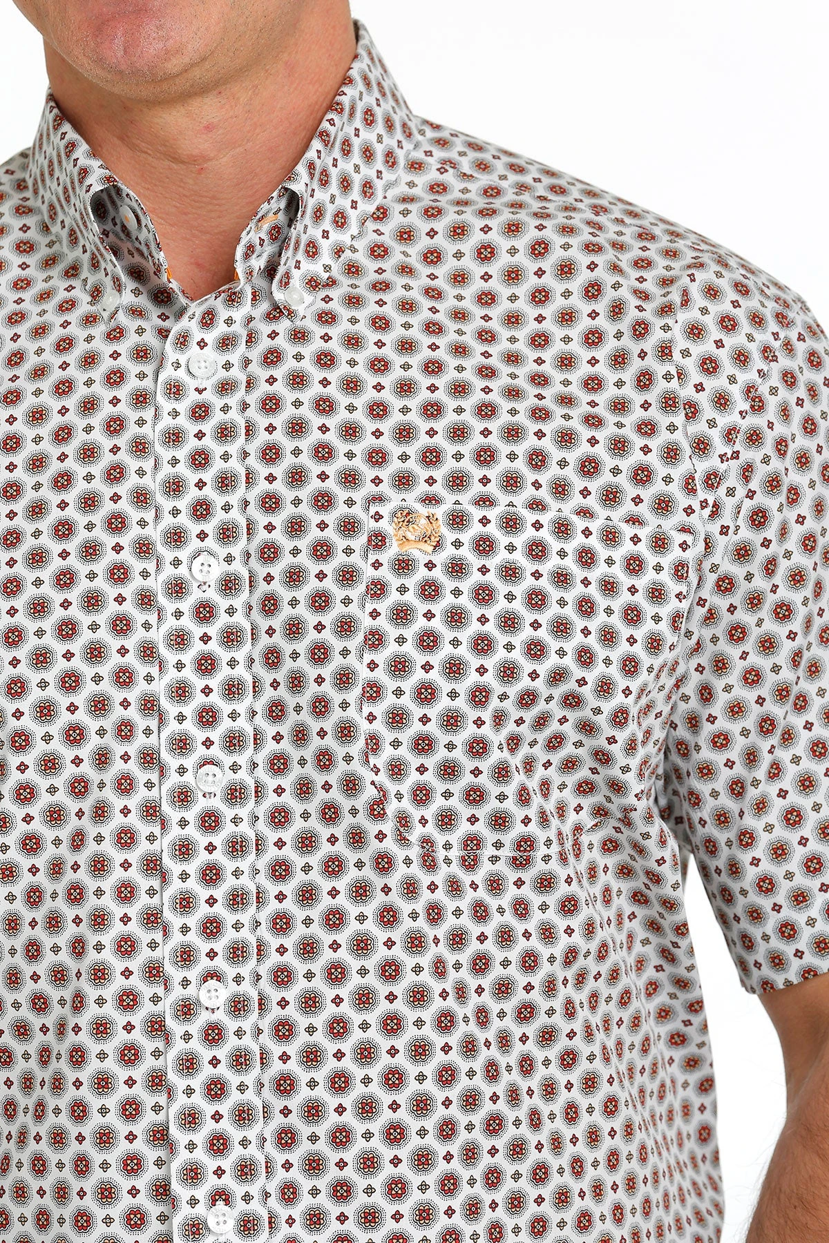 White with Red Medallion Print Short Sleeve Button Down Shirt.