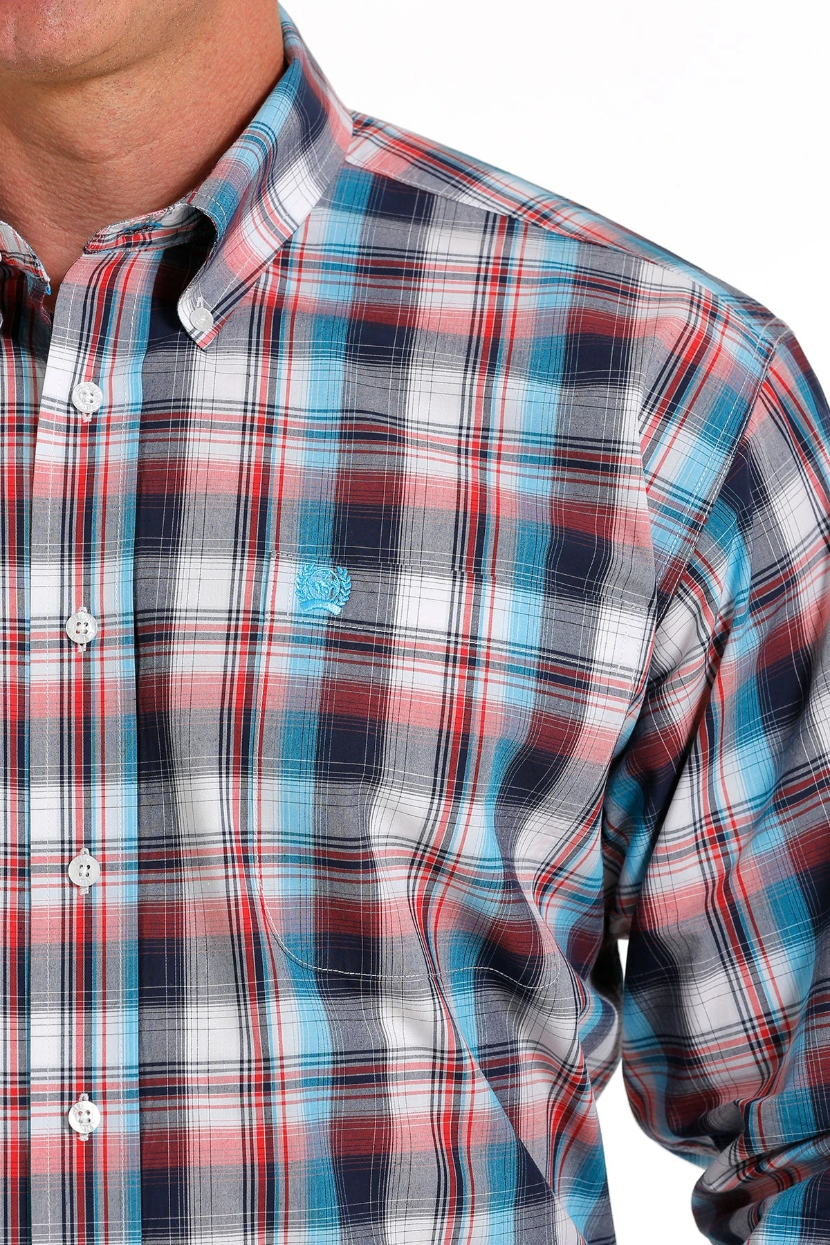 White, Red and Navy Plaid Long Sleeve Button Down Shirt.