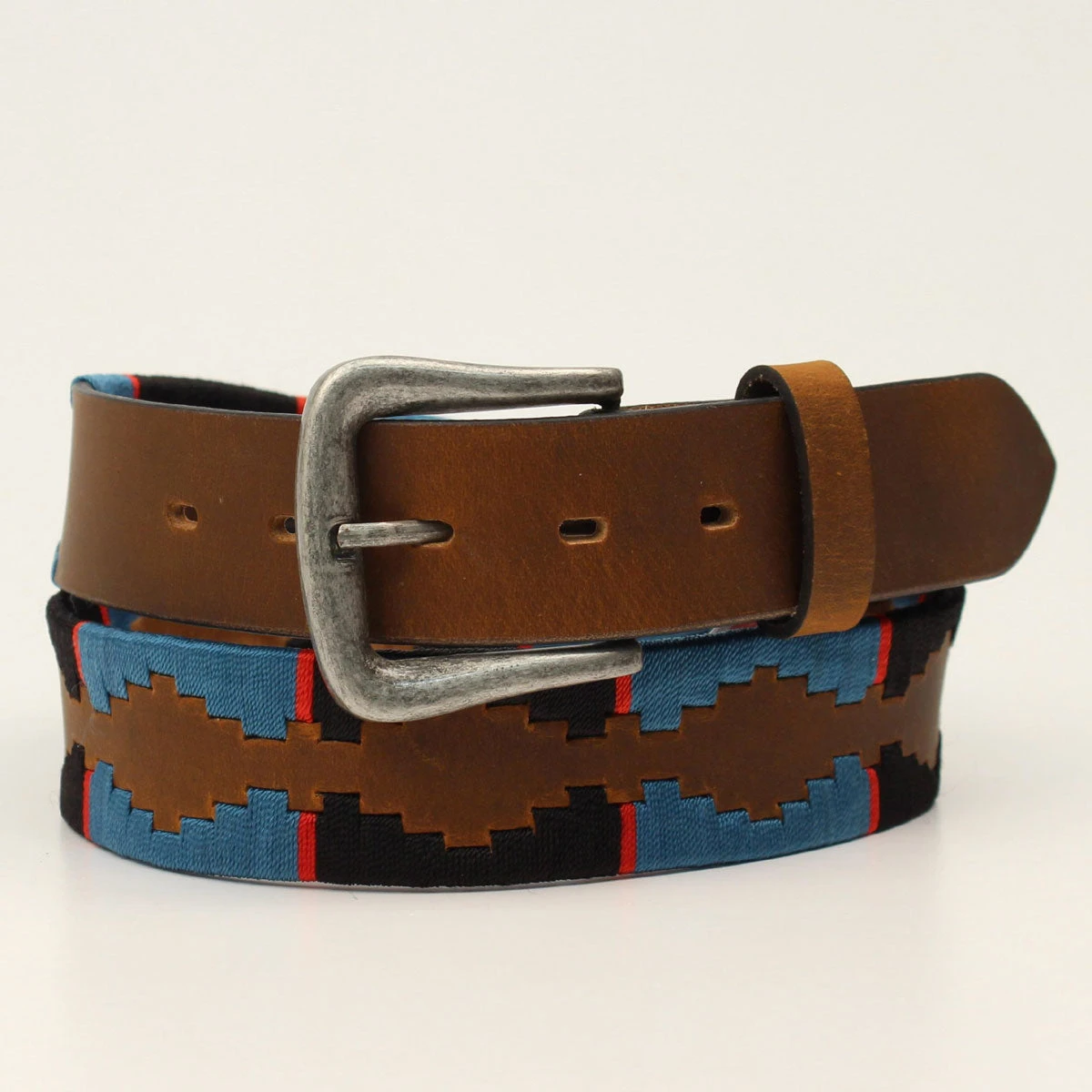 Brown Western Belt with Black and Blue Stitched Pattern.
