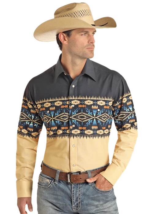 Navy and Cream Aztec Border Print Long Sleeve Snap Front Shirt.