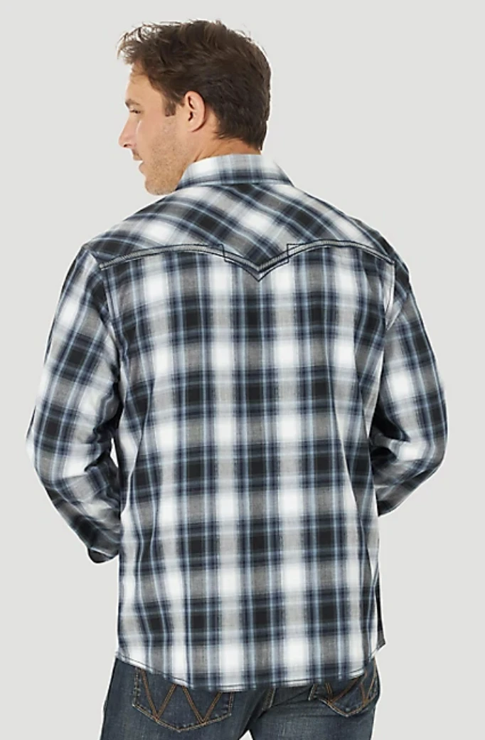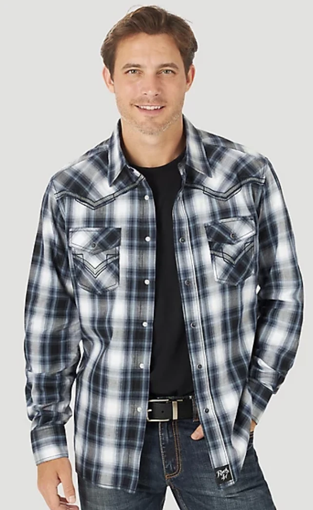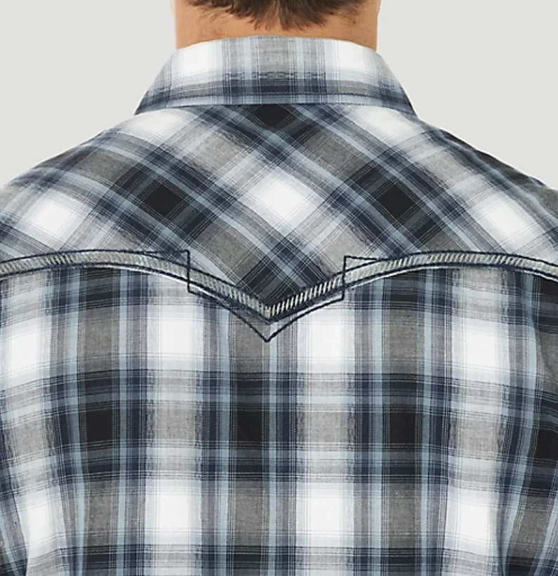 Nero Plaid Long Sleeve Snap Front Shirt with Decorative Embroidery and Contrast Trim.
