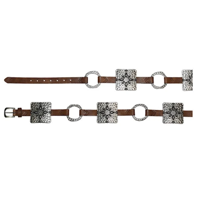 Brown Strap Western Belt with Old Silver Conchos and Textured Metal Rings.