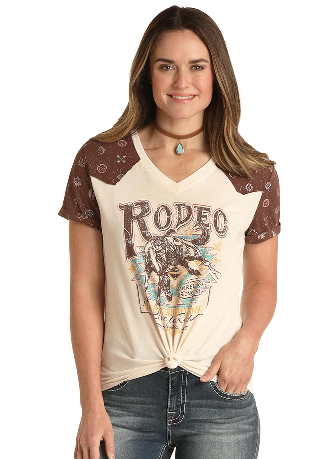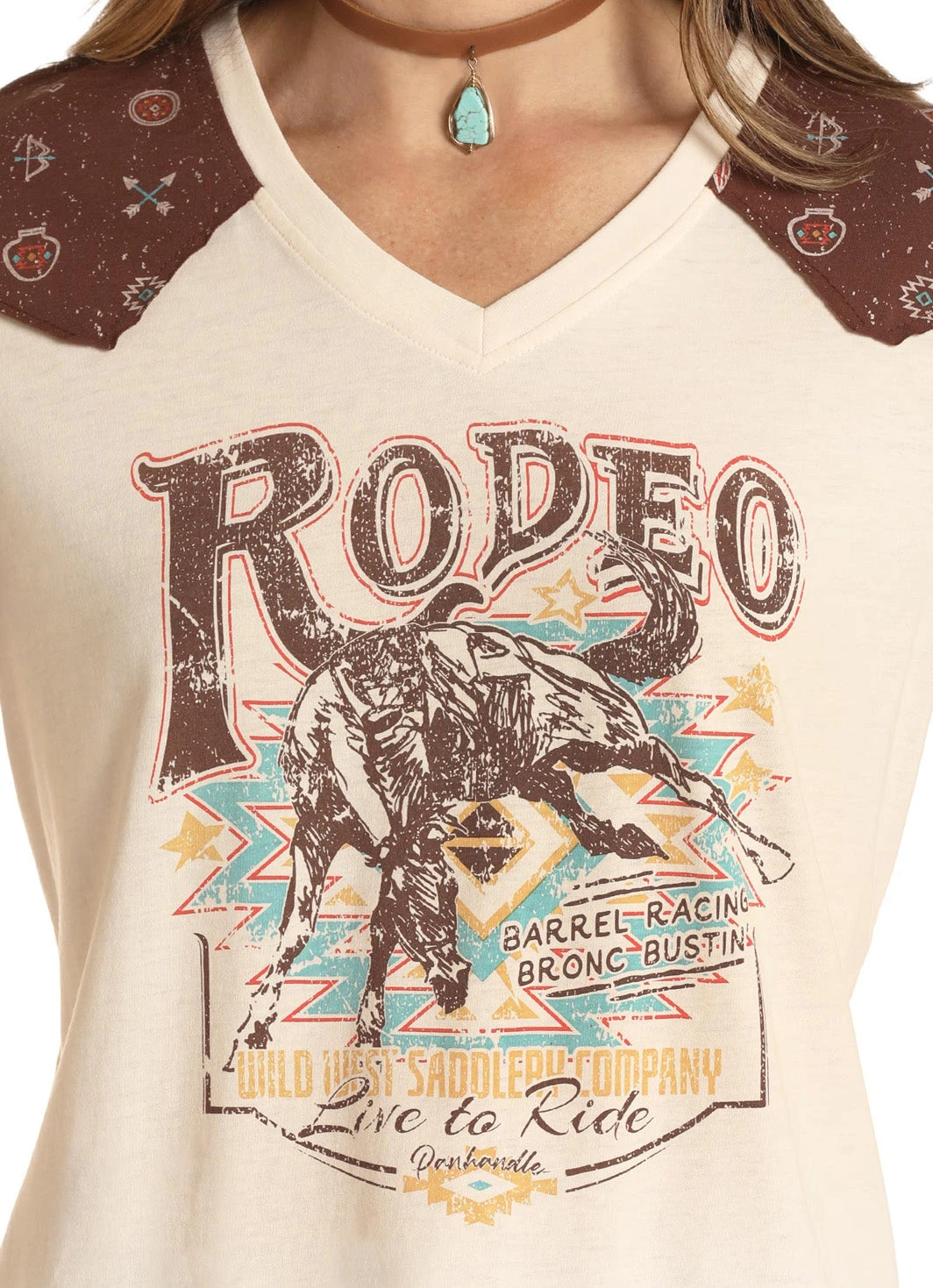 Natural Short Sleeve T-Shirt with Rodeo Screen Print and Brown Print Yokes.