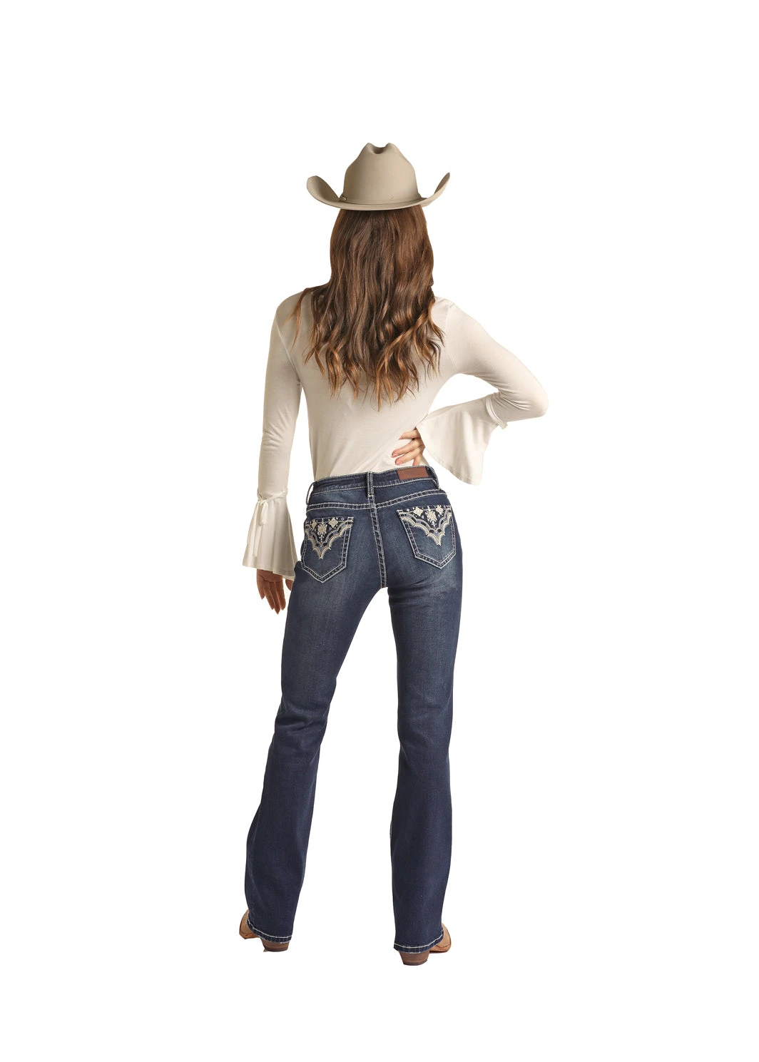 Medium Wash Bootcut Jean with Blue and Ivory Aztec Pocket.