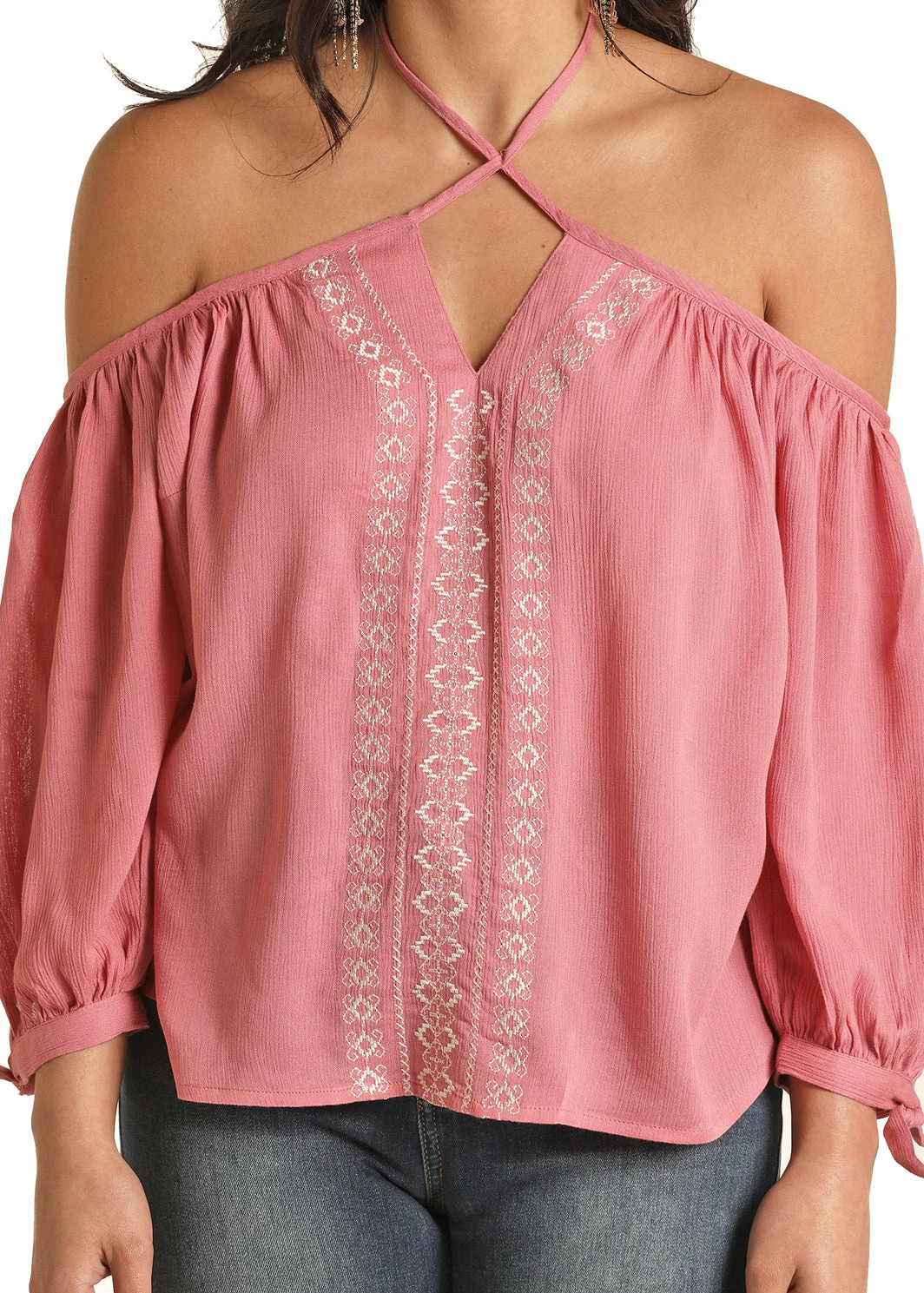 Rose Long Sleeve Cold Shoulder Blouse with Cream Embroidery.