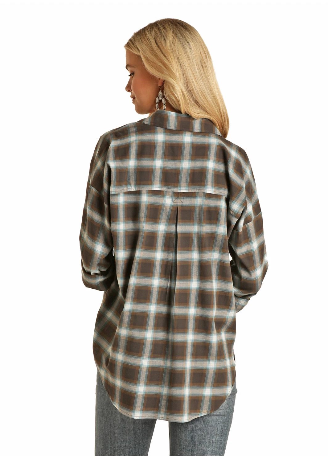 Brown and Turquoise Brushed Plaid Long Sleeve Snap Front Shirt.