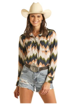 Cream and Navy Zig Zag Print Long Sleeve Snap Front Shirt.