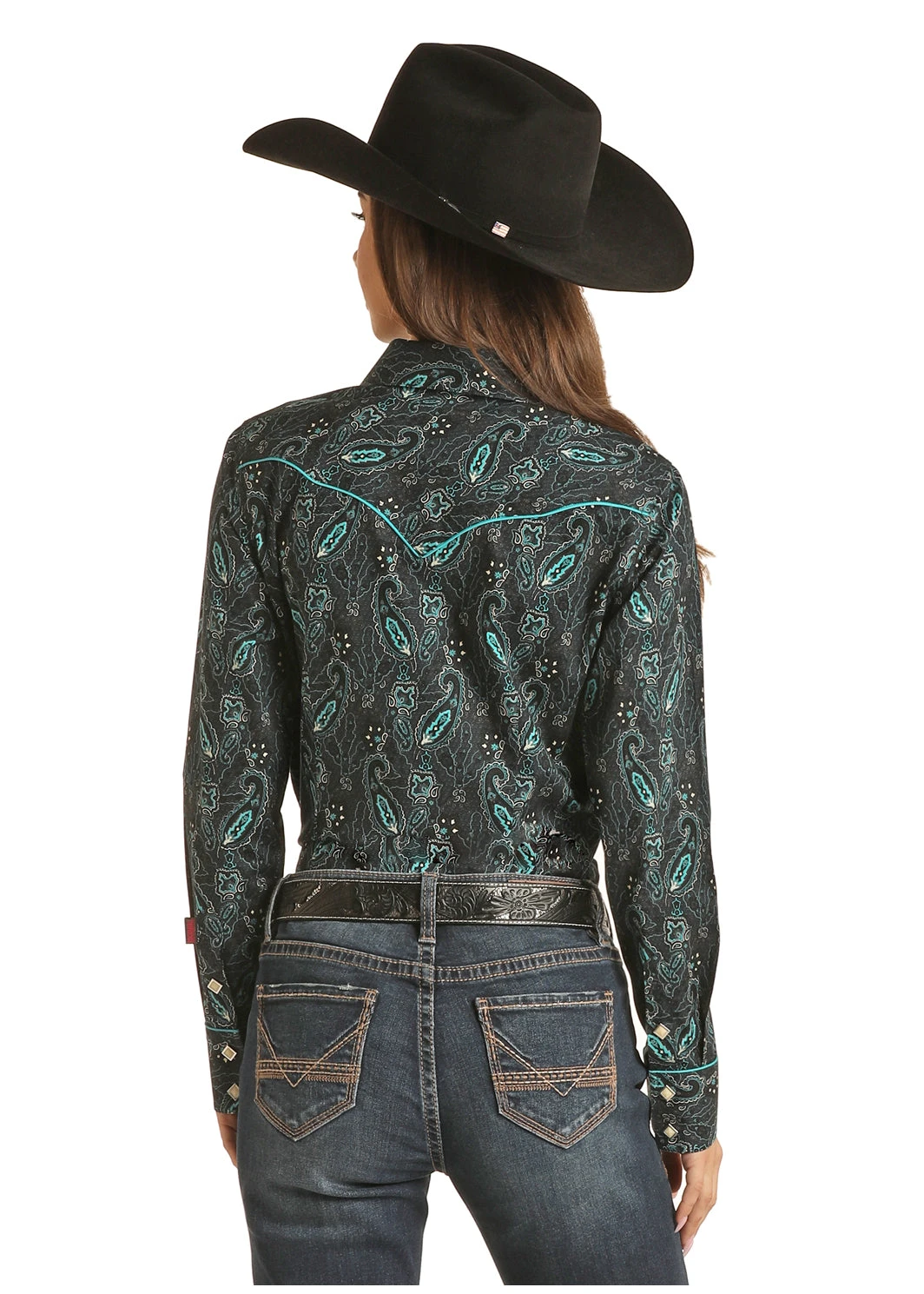 Black and Turquoise Paisley Long Sleeve Snap Front Shirt.
