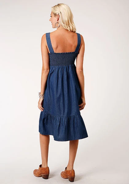 Dark Blue Denim Dress with Multi-Color Embroidery on Front Bodice.