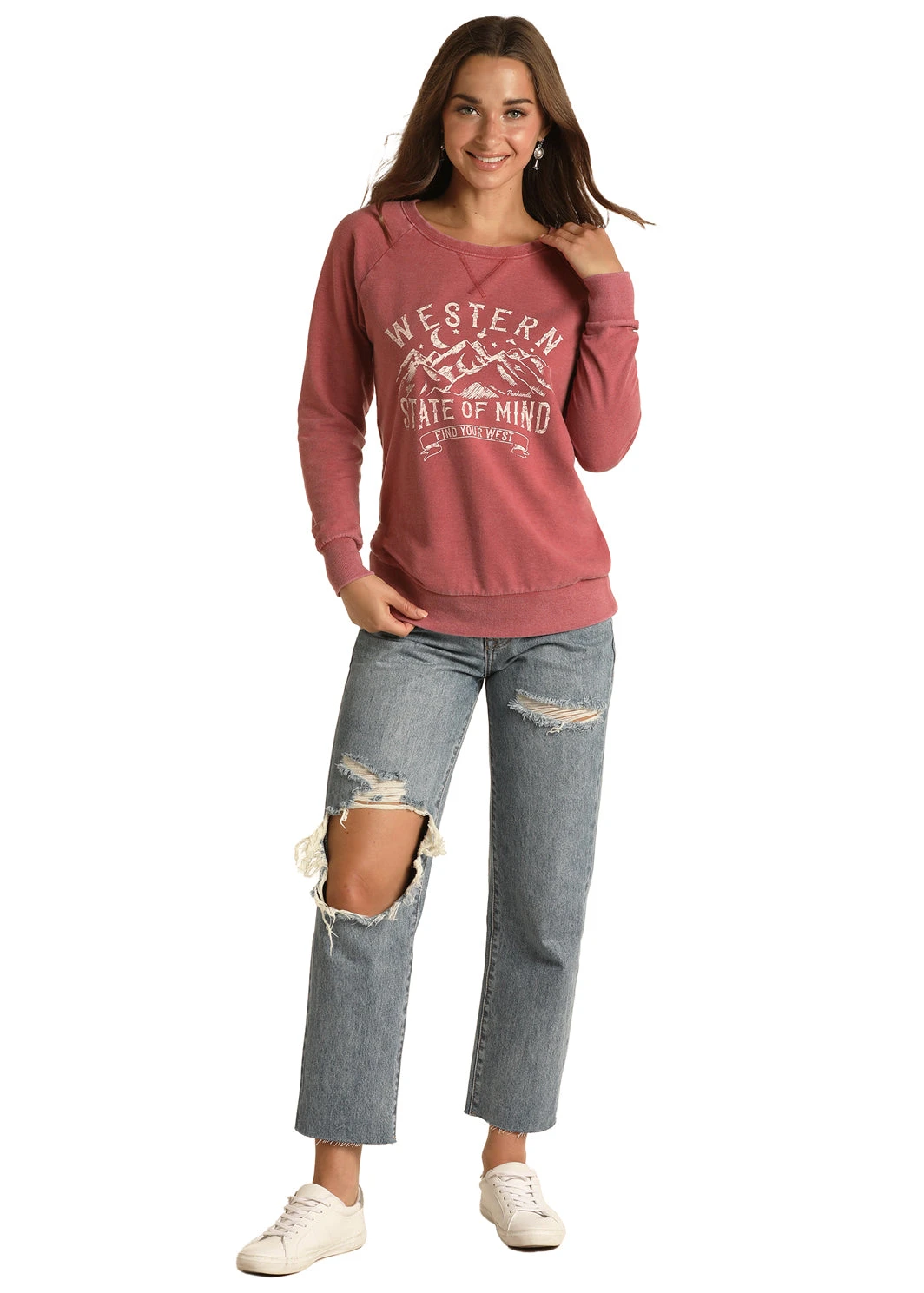 Washed Scarlet Sweatshirt with Mountain Graphic.