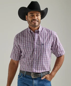 Mid Pink Plaid Short Sleeve Button Down Shirt.